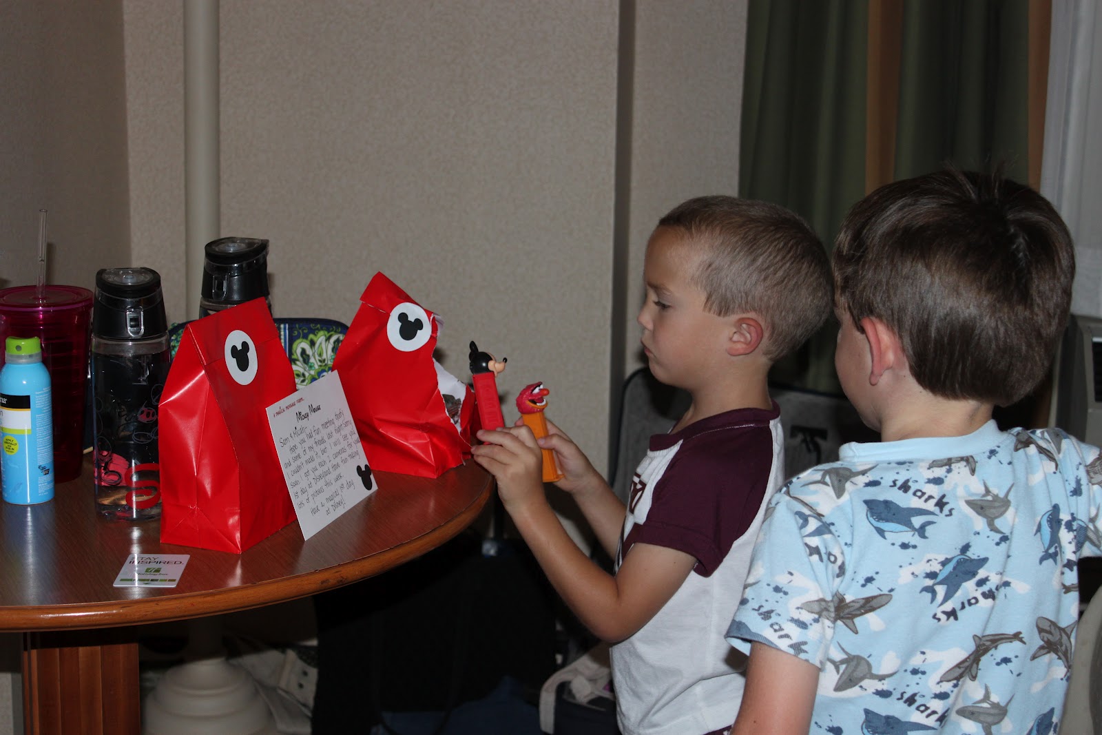 The first morning Mickey brought them each 2 disposable cameras and 2 pez dispensers.